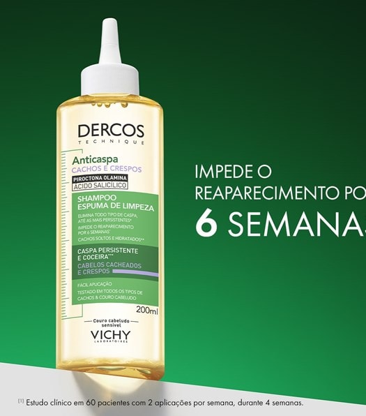 INOVAÇÃO: A 1ª tecnologia anticaspa de Dercos 100% desenvolvida para eliminar a caspa em cachos e crespos, deixando-os mais soltos e nutridos instantaneamente. O Shampoo Espuma de Limpeza para cabelos cacheados e crespos é enriquecido com a tecnologia Piroctona Olamina e Ácido Salicílico para combater a caspa e impedir o reaparecimento por até 6 semanas. Testado em todos os tipos de cachos e couro cabeludo. Incluso bico aplicador para melhor experiência de uso, que permite uma aplicação diretamente no couro cabeludo.