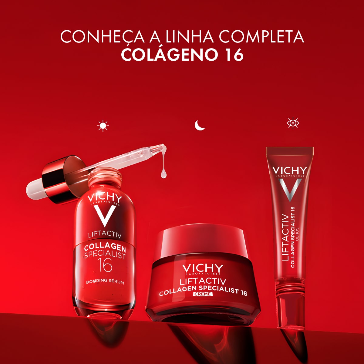 O creme LIFTACTIV COLÁGENO SPECIALIST 16 é o primeiro creme facial dos Laboratórios Vichy a incorporar a tecnologia Co-Bonding, uma combinação de 3 ingredientes ativos que estimulam a produção de todas as famílias de colágeno, para uma pele mais firme, macia e tonificada.